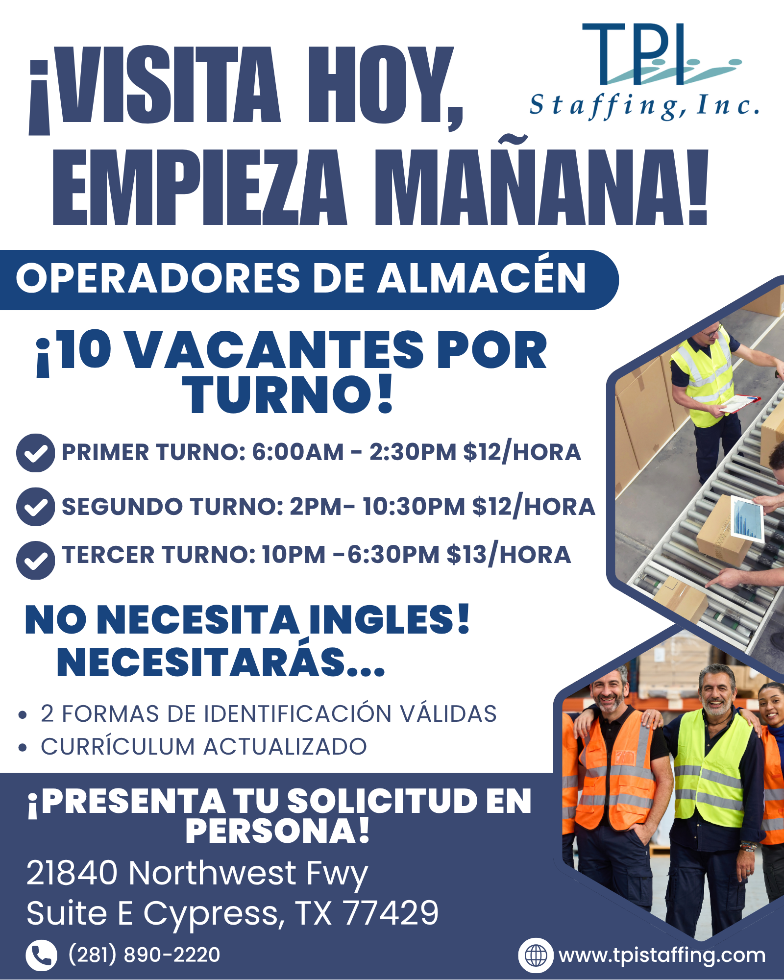 We are hiring General Warehouse Operators for a plastic injection molding company. This is an entry-level position with simple, repetitive tasks. Spanish-only speakers are welcome—no English required.